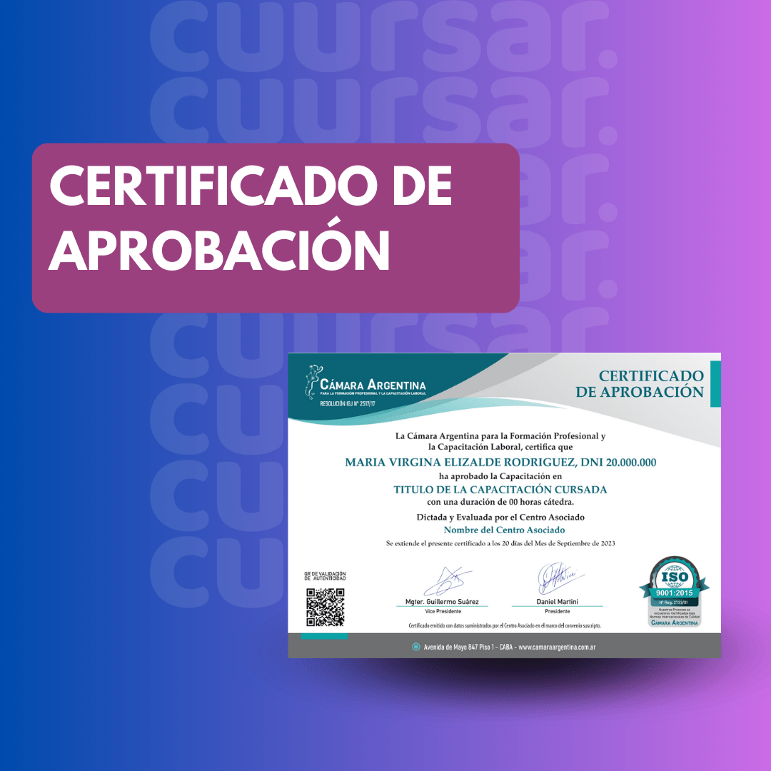 Si ya completaste o estás a punto de finalizar nuestros cursos, solicita el certificado de aprobación de la Cámara Argentina para la formación para obtener tu doble certificación y añadir valor a tu perfil profesional.
